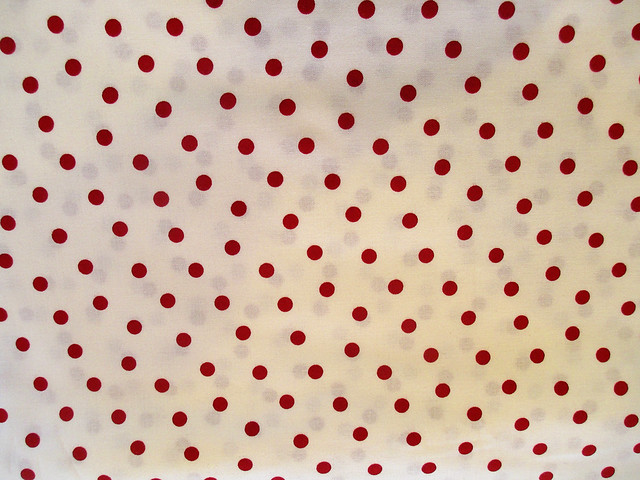And how about the backing I bought? What looks like shadows is the layer folded beneath showing through. The red dots are about 1/4 inch in diameter and they are about 1 inch apart. The dots are randomly scattered rather than in aligned rows. I like it!