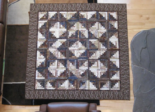 Shelly recently commented wondering how to make a king sized version of my “Winter Log Cabin” quilt. The original quilt seen below used 7-inch finished “cabins” where the “logs” were 1-inch wide each. It was eight blocks wide (56 inches) with 2 inch inner borders (+4) and six inch (+12) outer borders making the final quilt a nice throw size of 72 inches square.