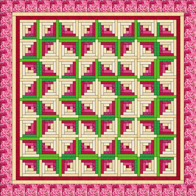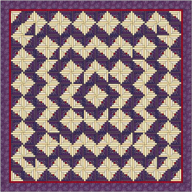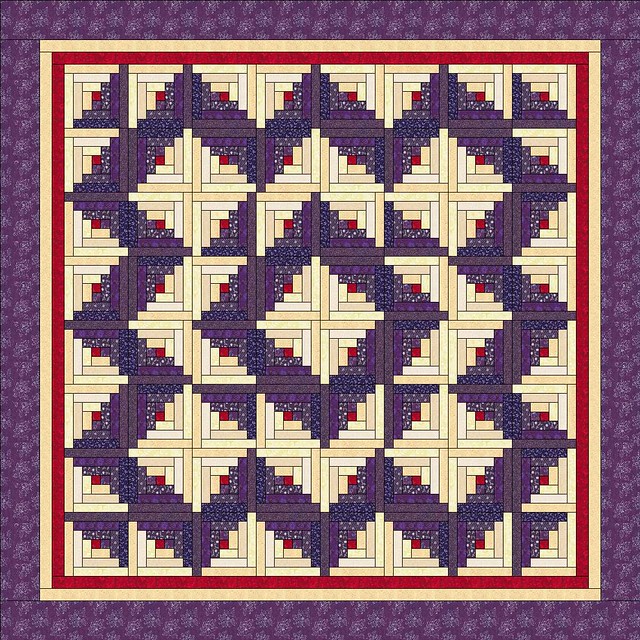 You could simply make the “logs” 1.5 inches wide (84 inches), add two 2-inch inner borders( + 8 inches) and a 6.5 inch outer border (+ 13 inches) and have a final size of 105 inches square like this nice cream and purple example I drew up in EQ7: