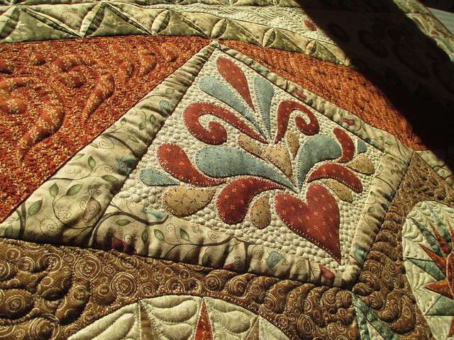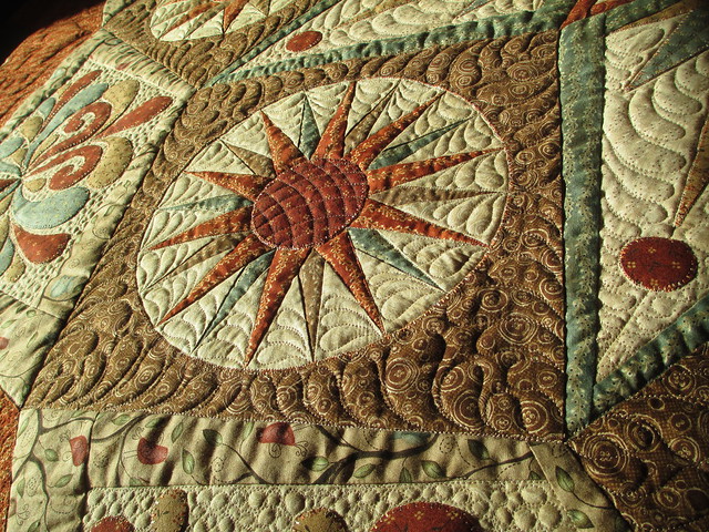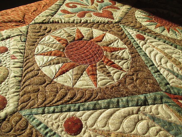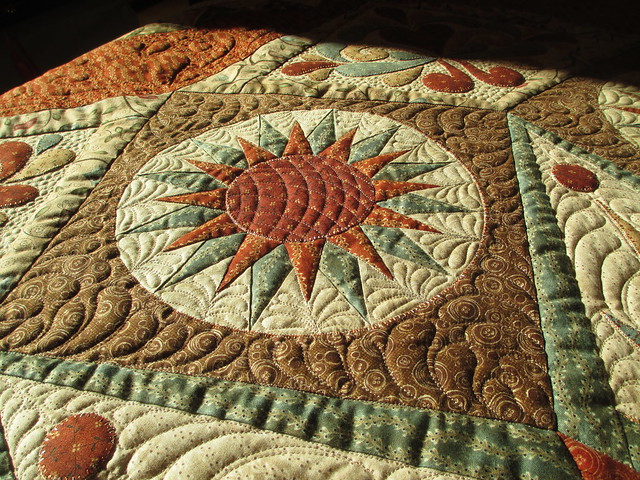 I did it, I finally did it. The “Sedona Star” from the TQS 2012 BOM is finally completed. It has been on my longarm quilting machine since May!
