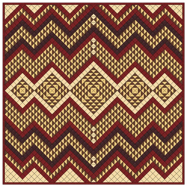 Some features of the design are hsts pointing toward the left on the right side of the top and hsts pointing toward the right on the left side, five “barn raising” arrangements of hsts across the center, solid red, white and brown zig-zags, and a narrow brown outside border.