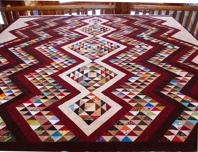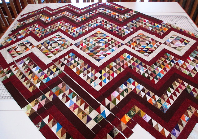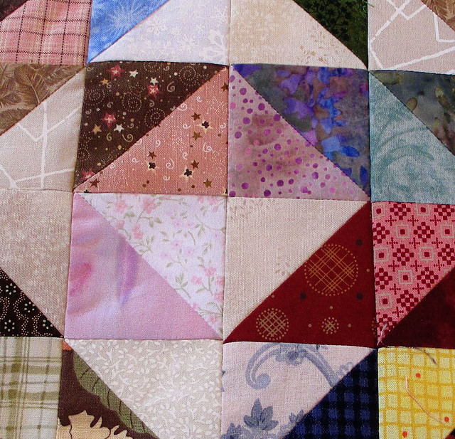 Of course, the real quilt employed many different colors and patterns of hsts. This is a picture during construction. The hsts and some filler red, white and browns were sewn into diagonal rows first.: