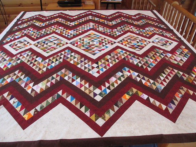 Some features of the design are hsts pointing toward the left on the right side of the top and hsts pointing toward the right on the left side, five “barn raising” arrangements of hsts across the center, solid red, white and brown zig-zags, and a narrow brown outside border.