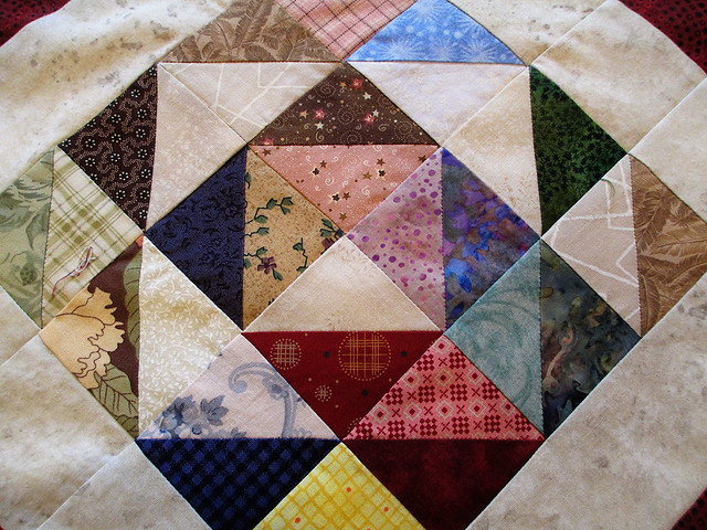 Early in 2013 our little quilting group in my small town was inspired by Edyta Sitar’s book, “Friendship Triangles” to start a half-square-triangle exchange.