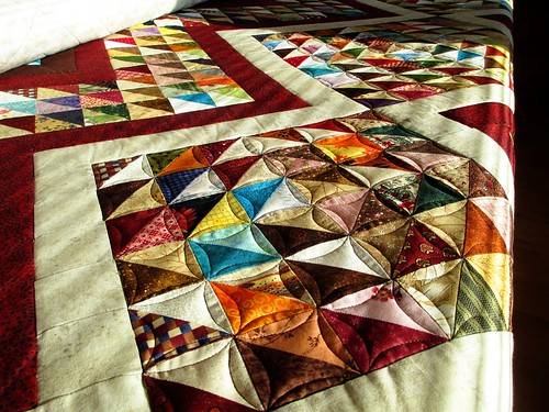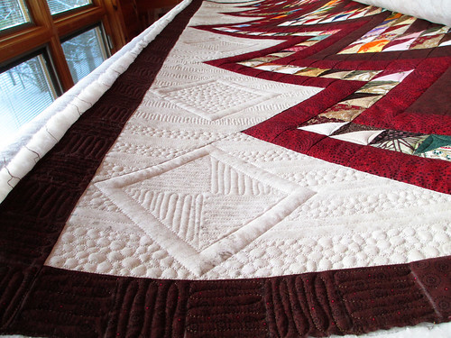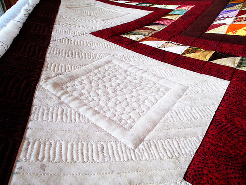 So now my next task is to quilt the other white end area like the first one. After that, I will quilt inside the red and brown chevrons. I will keep you posted on further progress.