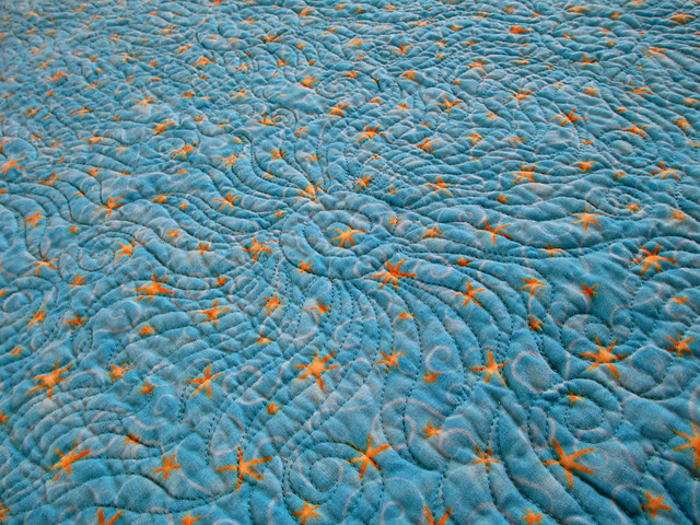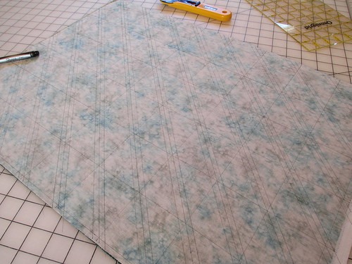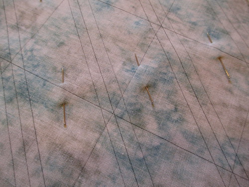 Pin lots of places between the diagonal lines, making sure you will have room to machine sew on the diagonal lines: